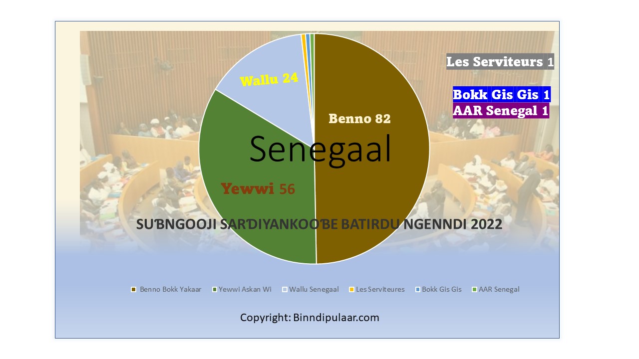 Ndiin njeeñcudi (resultaaji) ko nii lelorii: Benno BokkaYaakar, lannda laamiiɓe o, dañii 82 cuɓaaɗo, Yewi Askan Wi, mo Usmaan Sonko ardii, dañii 56 cuɓaaɗo. Wallu Senegal, mo hooreejo leydi kiiɗɗo o, Me Abdullay Wadda, dañii 24. Lanndaaji tati goɗɗi tokoosi, gooto e mum en fof dañi cuɓaaɗo gooto. Huunde ɓurnde teskinde he ɗii suɓngooji ko wonnde ngol ɗoo woni goo, gila Senegaal heɓi jeytaare mum ndimaagu dawrugol, lanndaaji lunndiyankooɓe ɗii ene ɓura lannda jooɗiiɓe he jappeere o sarɗiyankooɓe to Suudu Batirdu Ngenndi. Won yiyɓe wonnde ɗuum ene tinndina demokaraasi Senegaal ƴoƴtii haa hellifaama. Sabu demokaraasi nde waawata tiiɗde haa nafta ko alaa-e-sago, maa jogoo lunndo tiiɗngo, jogiingo hattan waawde dartaade laamu guu, e faddaade ɗum e waɗde kala ko wela. Kadi ɗuum waawata heɓaade tan ko so tawii lunndo ngoo ene jogii sarɗiyankooɓe yonɓe to Batirdu Ngenndi too, waawɓe aynude laamu nguu e yuurnitaade golle mum.